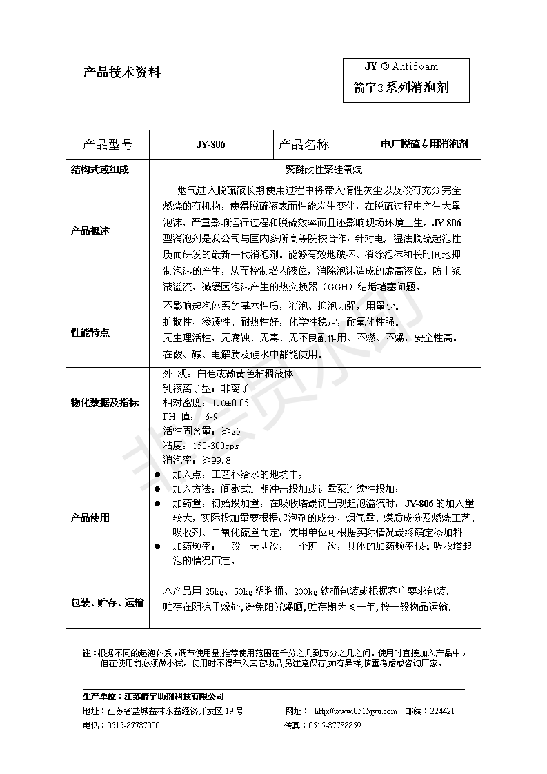 电厂水处理有机硅型消泡剂JY-806